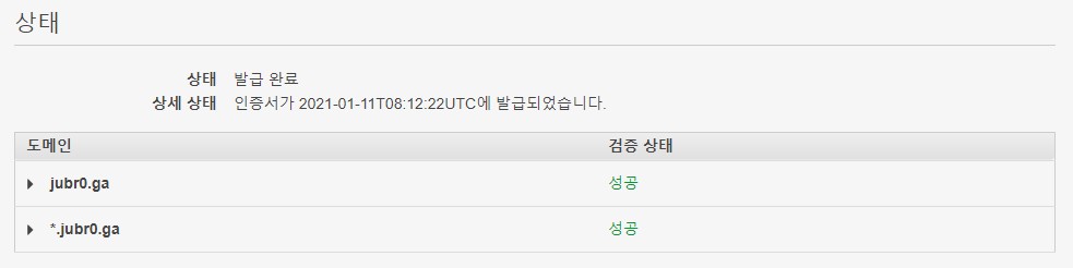인증서가 발급되어 ALB에 적용하여 SSL 통신이 가능하도록 만들 수 있습니다.